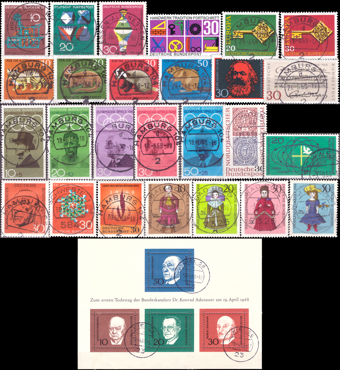 Briefmarken BRD (Bund) Jahrgang 1968 komplett, Mi.Nr. 546-575. Gestempelt