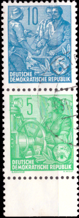 Briefmarken: DDR 1955, Mi.Nr. aus MHB 1, S 5 (453/406), Zusammendruck aus Markenheftchenbogen 1, Fünfjahrplan. Gestempelt