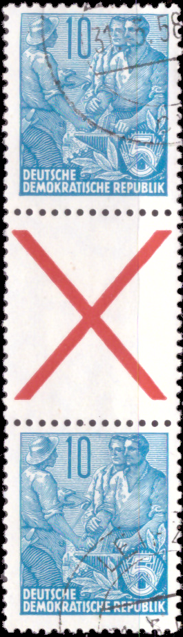 Briefmarken: DDR 1955, Mi.Nr. aus MHB 1, SZ 3 (453/x/453), Zusammendruck aus Markenheftchenbogen 1, Fünfjahrplan. Gestempelt